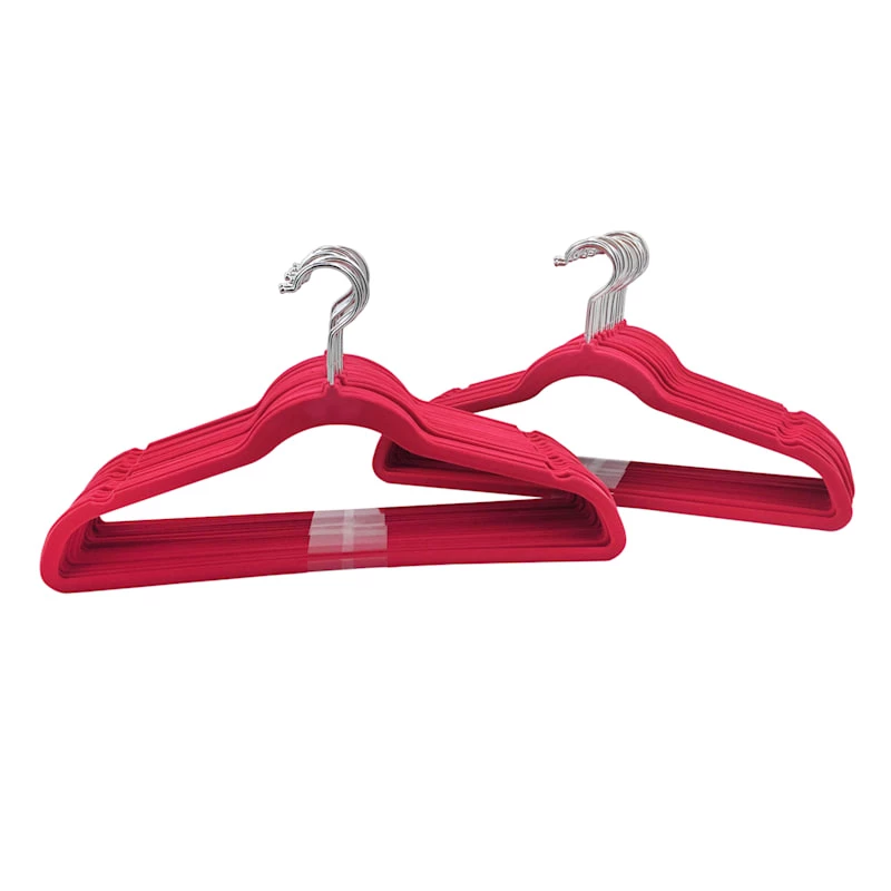 Fear not, fabulous fashionistas! We have the perfect solution to your crowded closets. This raspberry red velvet hanger pack of 50 features non-slip flocking—so no more clothes sliding off the hangers and onto the floor! And the ultra-slim design means more space in your closet, too!