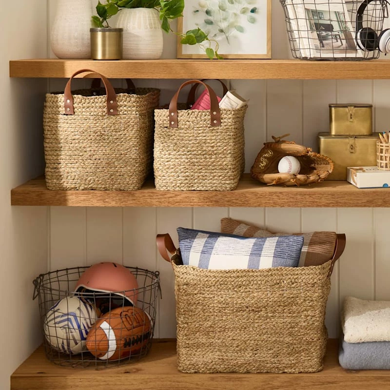 Honeybloom Austin Rectangle Seagrass Storage Basket With Leather Handles, Small