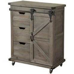 Take your storage decor to a new level with our Jacob 3-drawer barn door cabinet that is full of casual farmhouse charm. This cabinet helps you stow items that you want to keep handy but out of sight and brings a rustic and charming vibe to any entryway or living room, and can even be used as a kitchen island. Anchored by casters that make Jacob portable, the wood/manufactured wood storage chest boasts a rustic, weathered finish. The cabinet door opens like a barn door and offers farmhouse appeal.