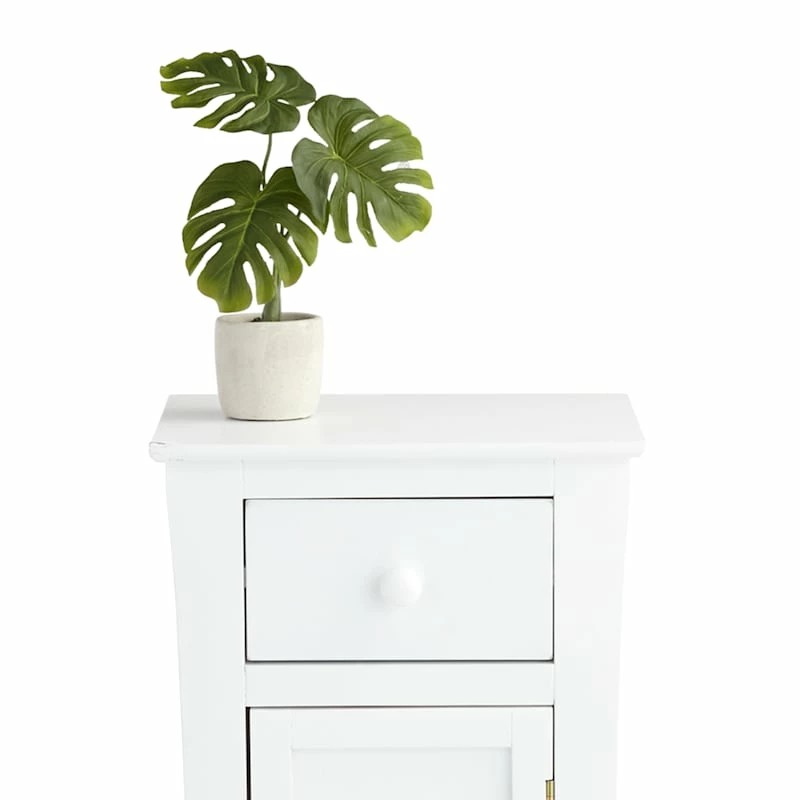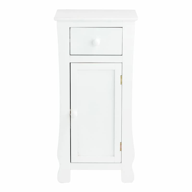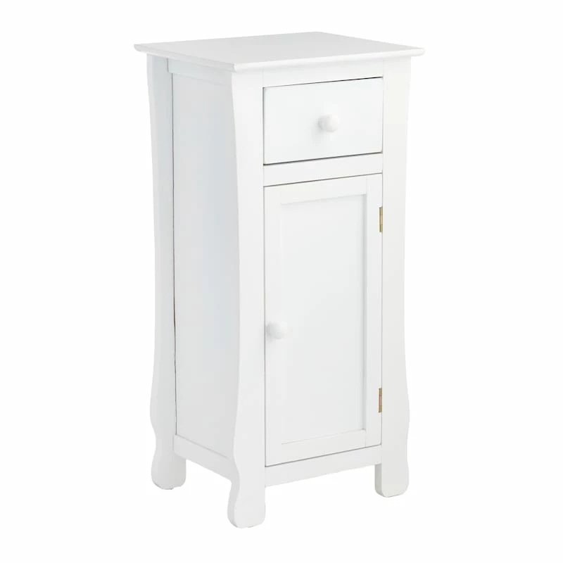 This small white cabinet with drawer, button knobs and curved shape is the cutest addition to any style of decor! Get creative by dressing it up with a vase or a plant. Use it in the living room to store stationery (never lose a pen again!) or other small items in this end table with storage drawer. Place books in the cabinet and a lamp on top, and you have a sweet reading spot! Want to use it to dress up your bedroom? Go ahead! Kitchen? Do it! With this handy accent table, the possibilities are endless!